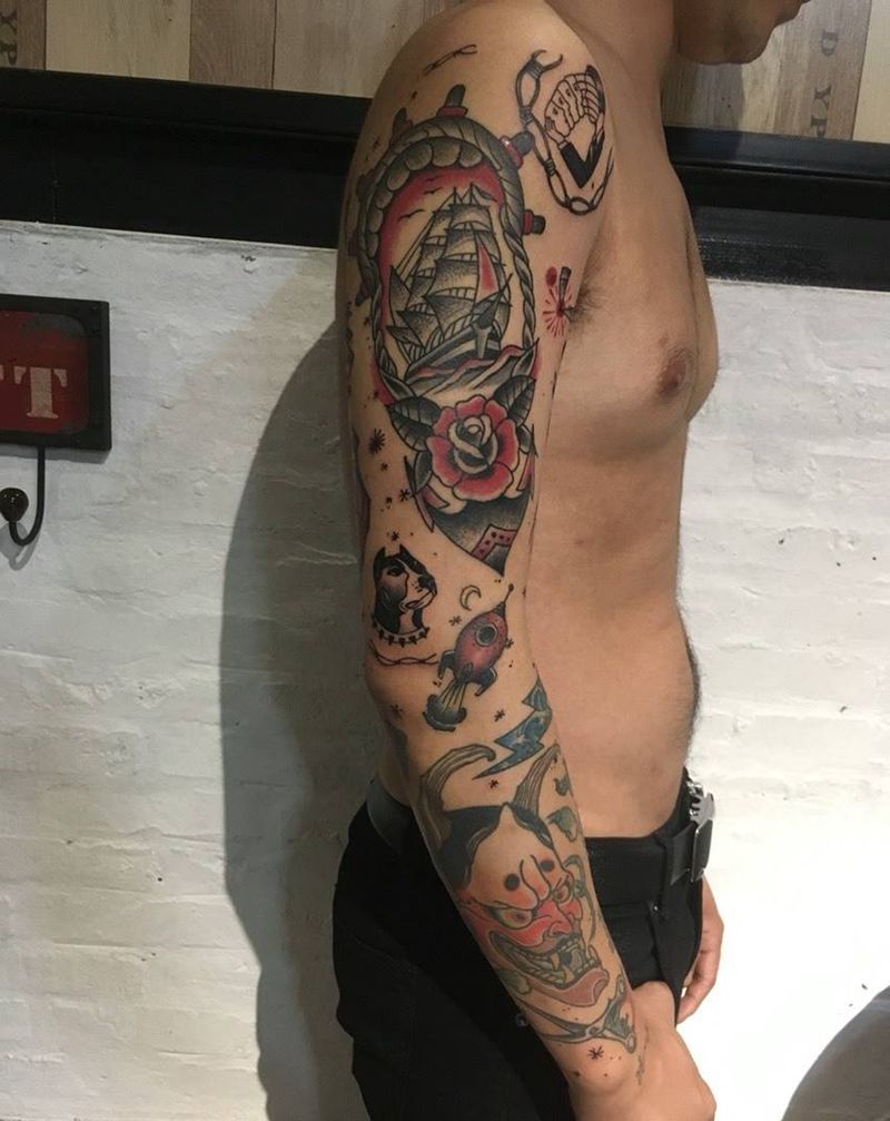 当前位置: 首页 >四川省成都市纹身店-合刺青纹身图案>Old school 拼接花臂纹身图片