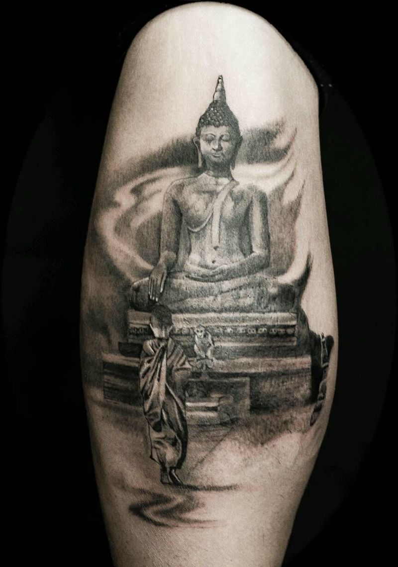 当前位置: 首页 >四川省成都市纹身店-成都怪兽巫纹身刺青工作室纹身图案>佛纹身图片_腿部写实人物成品纹身图案