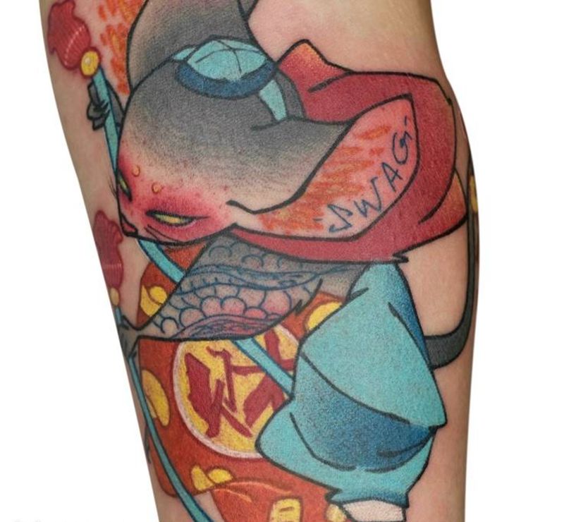 当前位置: 首页 >四川省成都市纹身店-成都怪兽巫纹身刺青工作室纹身图案>鼠你最富纹身图片_手臂New School纹身图案