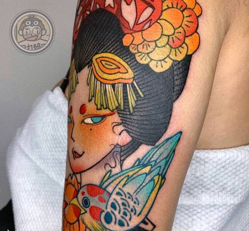 当前位置: 首页 >四川省成都市纹身店-成都怪兽巫纹身刺青工作室纹身图案>艺妓戏鸟纹身图片_手臂纹身图案