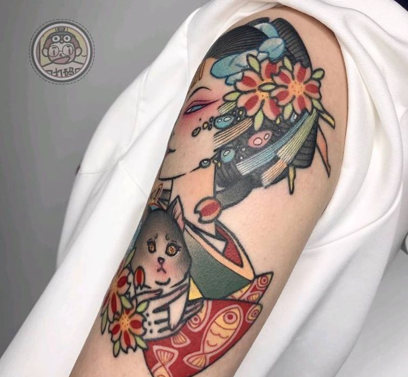 当前位置: 首页 >四川省成都市纹身店-成都怪兽巫纹身刺青工作室纹身图案>艺伎纹身图片_手臂New School纹身图案