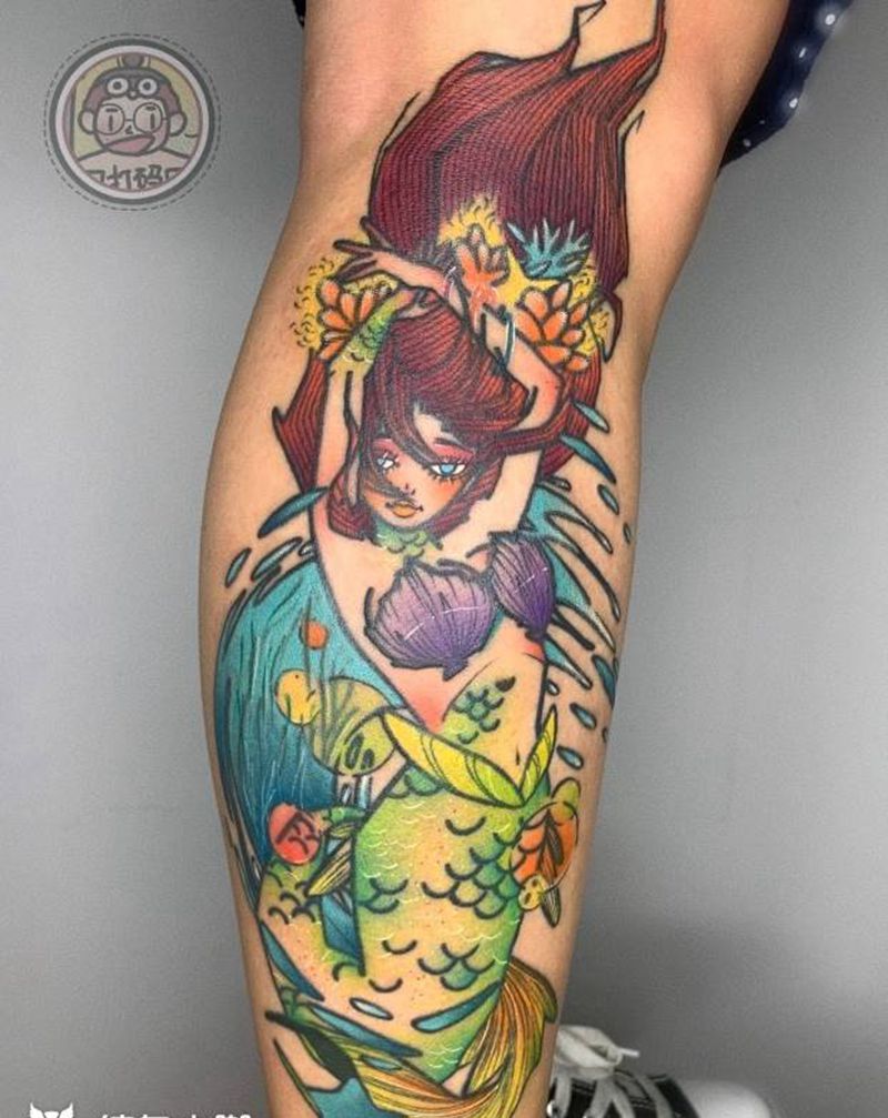 当前位置: 首页 >四川省成都市纹身店-成都怪兽巫纹身刺青工作室纹身图案>美人鱼纹身图片_腿部New School纹身图案
