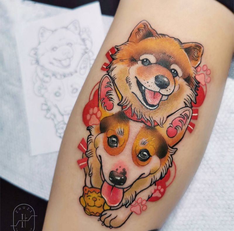 客人家的旺财纹身图片_脚部腿部New School纹身图案