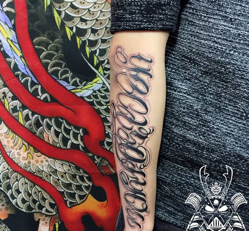 当前位置: 首页 >四川省成都市纹身店-天府刺青工作室纹身图案>花体纹身图片_成品手臂欧美字符纹身图案