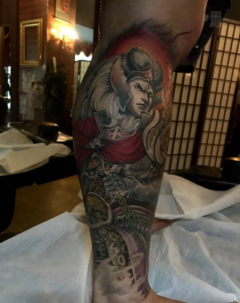 杨戬纹身图片_腿部脚部新传统水彩纹身图案