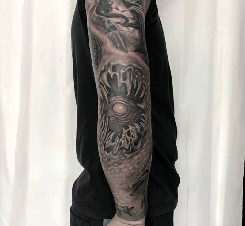 当前位置: 首页 >四川省成都市纹身店-成都喜欢纹身商店纹身图案>生化巨口纹身图片_手臂欧美写实暗黑生化纹身图案