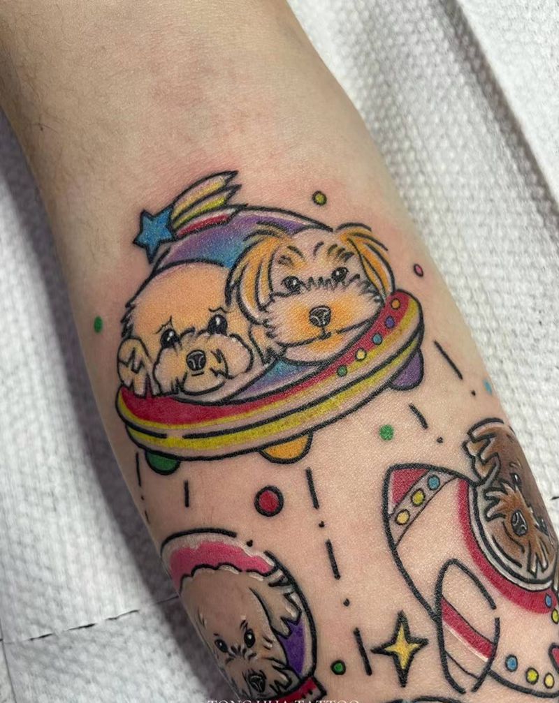 当前位置: 首页 >四川省成都市纹身店-桐花刺青纹身图案>卡通狗狗纹身图片_手臂New School纹身图案