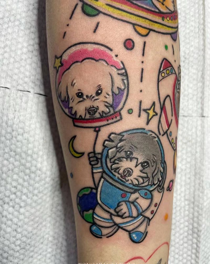 当前位置: 首页 >四川省成都市纹身店-桐花刺青纹身图案>卡通狗狗纹身图片_手臂New School纹身图案