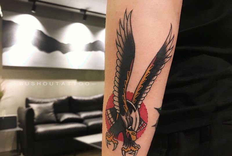 当前位置: 首页 >四川省成都市纹身店-部首刺青纹身图案>Oldschool老鹰纹身图片_手臂Old School老鹰纹身图案
