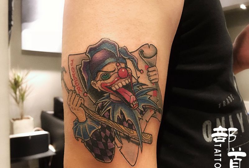 当前位置: 首页 >四川省成都市纹身店-部首刺青纹身图案>小丑扑克牌纹身图片_手臂New SchoolOld School扑克牌小丑 扑克牌纹身图案