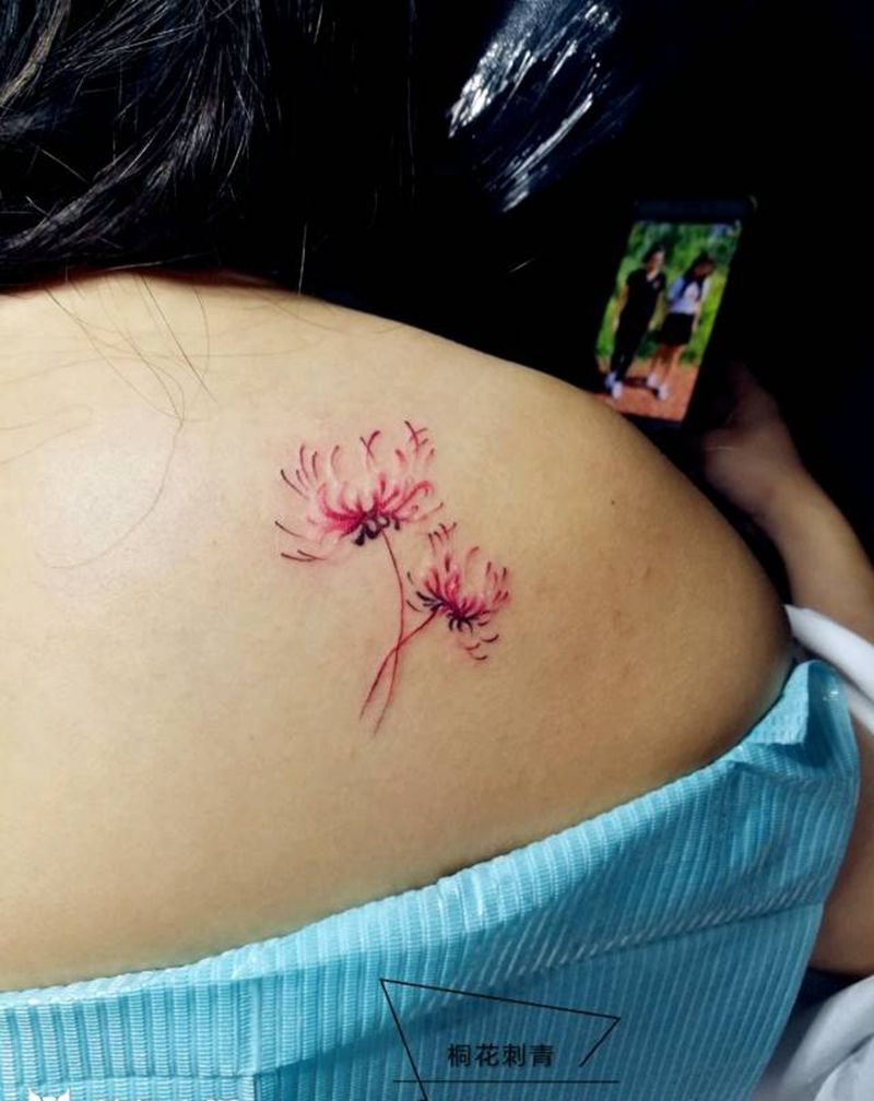当前位置: 首页 >四川省成都市纹身店-桐花刺青纹身图案>曼珠沙华。彼岸花纹身图片_肩部胸部清新植物纹身图案