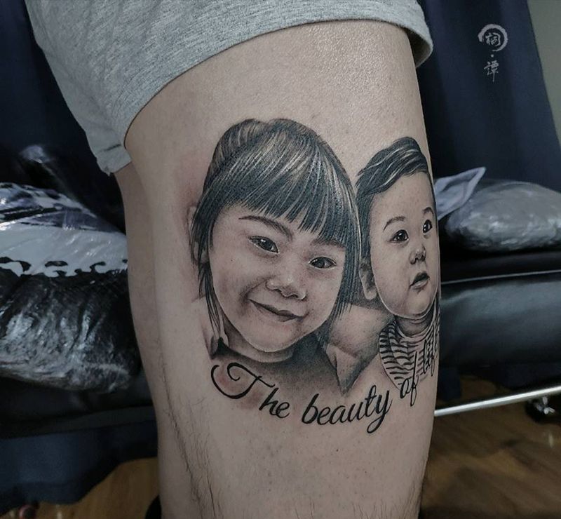 当前位置: 首页 >四川省成都市纹身店-桐花刺青纹身图案>儿女双全纹身图片_腿部欧美写实纹身图案
