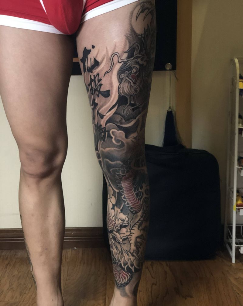 当前位置: 首页 >四川省成都市纹身店-黑川刺青纹身图案>龙腿纹身图片_腿部新传统书法牡丹龙纹身图案