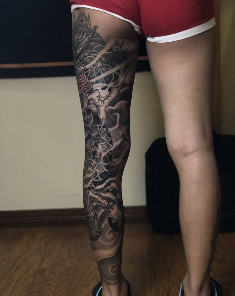 • T网红王老大花腿龙纹身图片_腿部新传统纹身图案