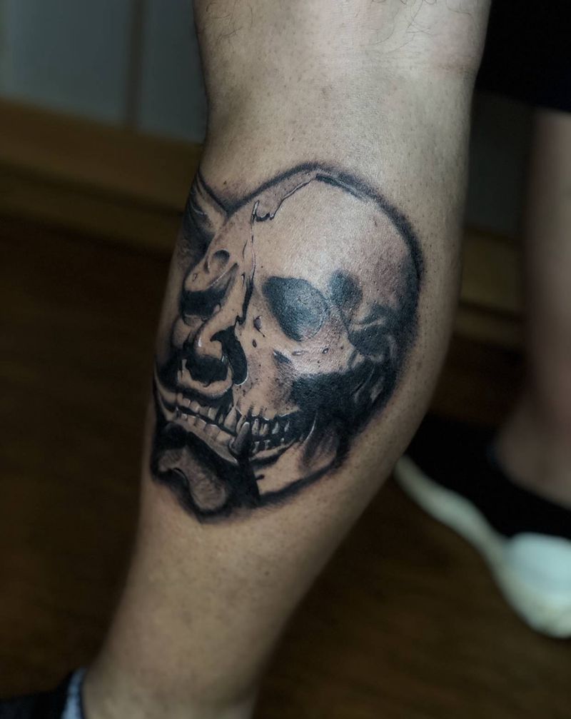 当前位置: 首页 >四川省成都市纹身店-黑川刺青纹身图案>般若面具&skull纹身图片_腿部欧美写实般若骷髅纹身图案