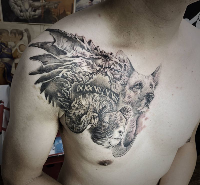 遮盖龙狗羊生肖组合纹身图片_胸部欧美写实龙生肖遮盖纹身图案