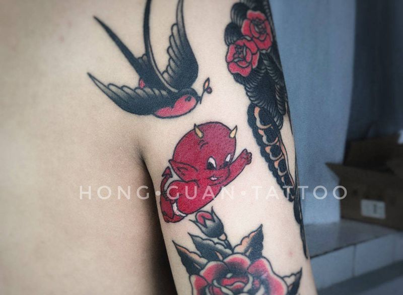 当前位置: 首页 >四川省成都市纹身店-墨善坊刺青纹身图案>oldshool拼接纹身图片_手臂Old School纹身图案