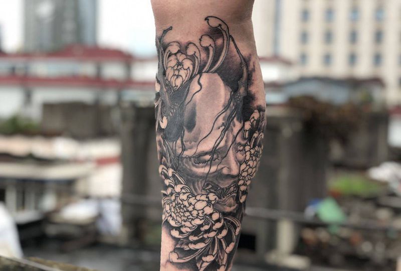 当前位置: 首页 >四川省成都市纹身店-墨善坊刺青纹身图案>般若|未完成纹身图片_腿部新传统般若菊花纹身图案