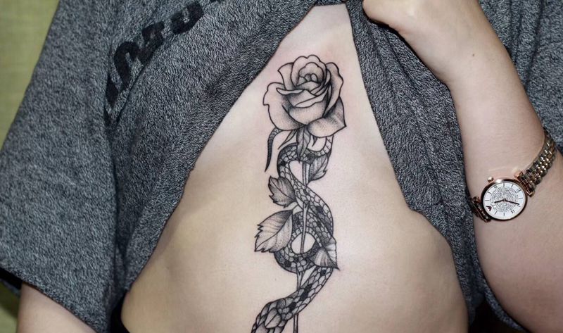 当前位置: 首页 >四川省成都市纹身店-怪咖纹身工作室纹身图案>蛇缠玫瑰