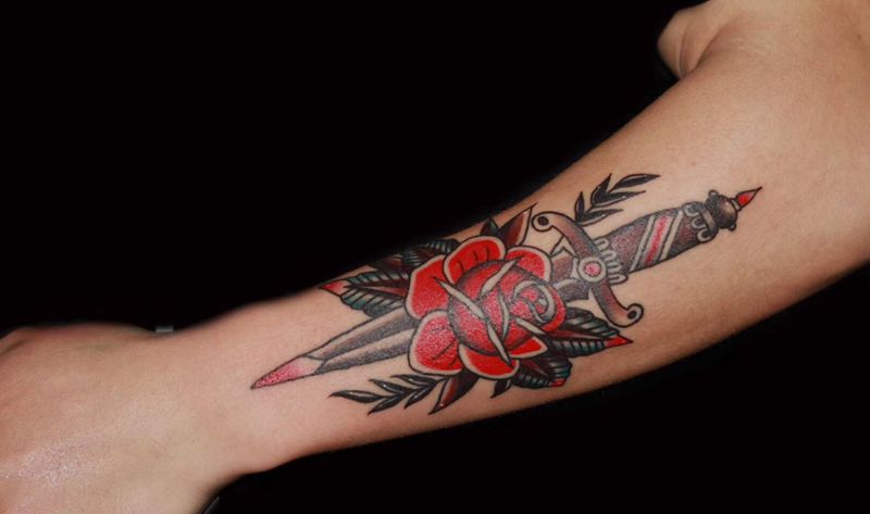 当前位置: 首页 >四川省成都市纹身店-怪咖纹身工作室纹身图案>匕首花纹身图片_手臂Old School纹身图案