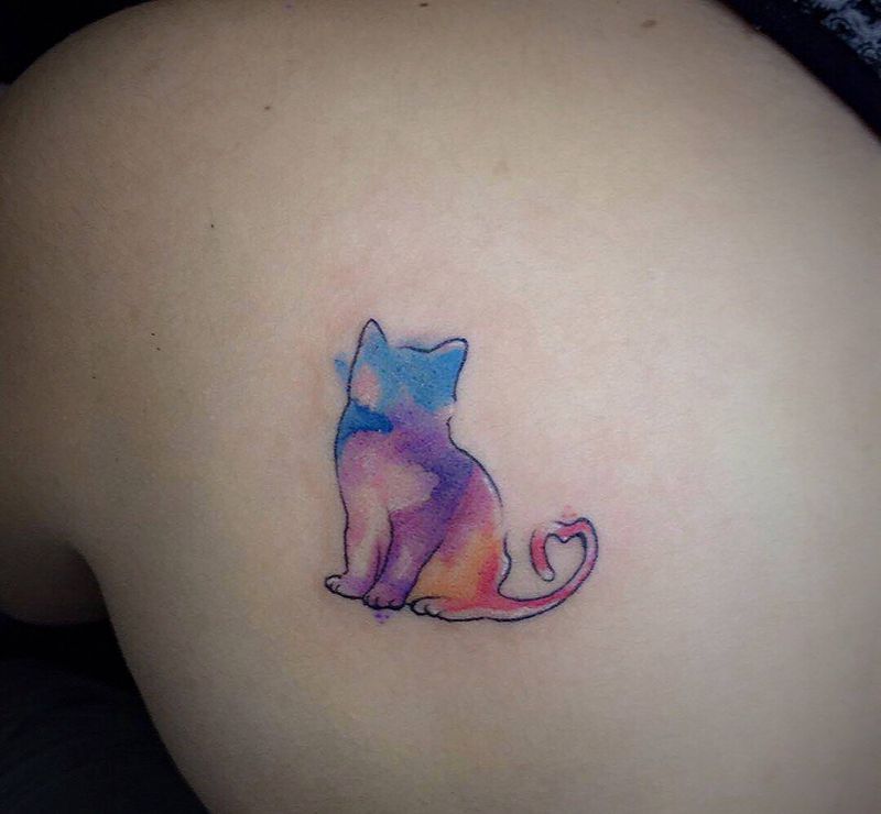 水彩小猫纹身图片_成品肩部清新动物纹身图案