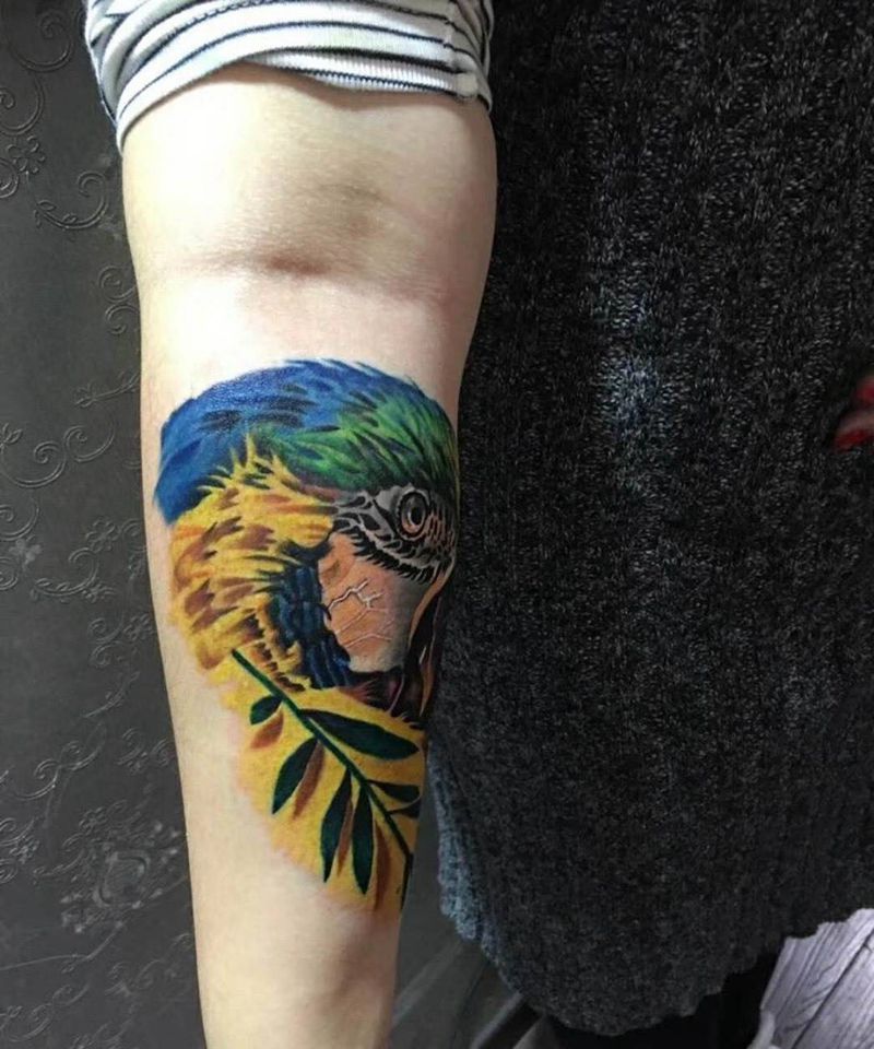 当前位置: 首页 >四川省成都市纹身店-肖邦刺青纹身图案>鹦鹉纹身图片_成品手臂写实动物纹身图案