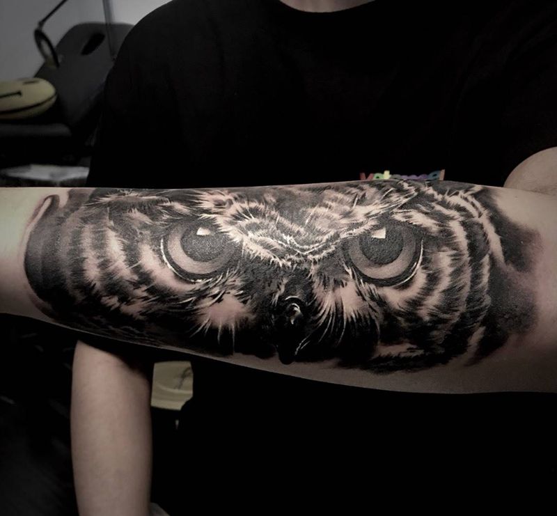 当前位置: 首页 >四川省成都市纹身店-火山刺青纹身图案>猫头 鹰纹身图片_手臂欧美写实纹身图案