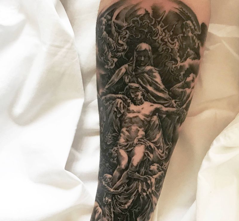 哀悼耶稣纹身图片_手臂欧美写实纹身图案