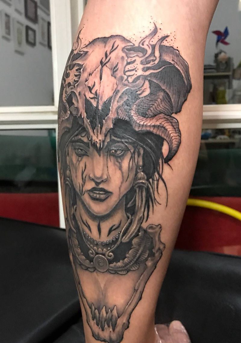 • T网红王老大花腿龙纹身图片_腿部新传统纹身图案
