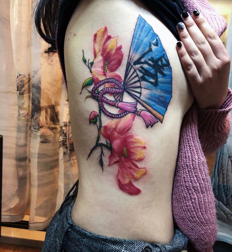 折扇 花卉纹身图片_腰部水彩水墨纹身图案