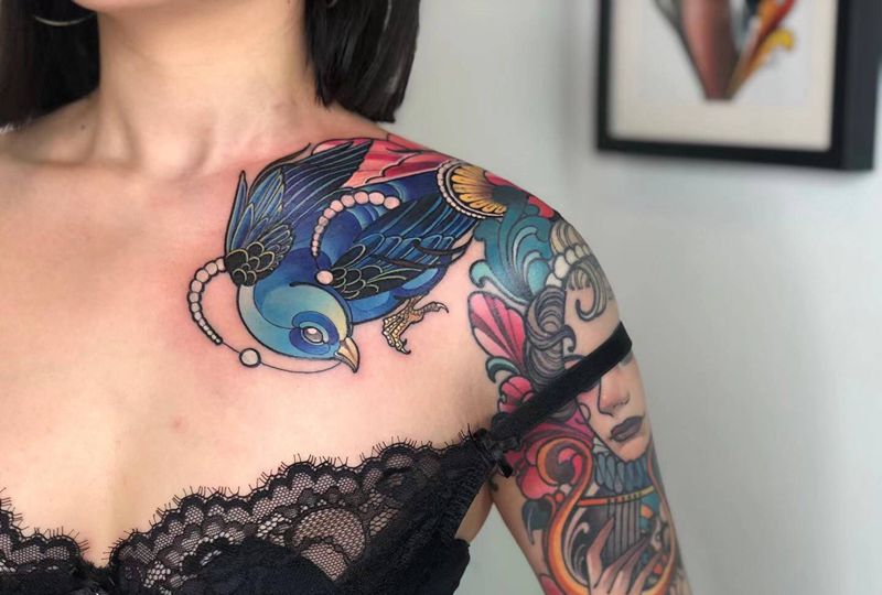 小字母,旧纹身遮盖纹身图片_肩部New School鸟纹身图案