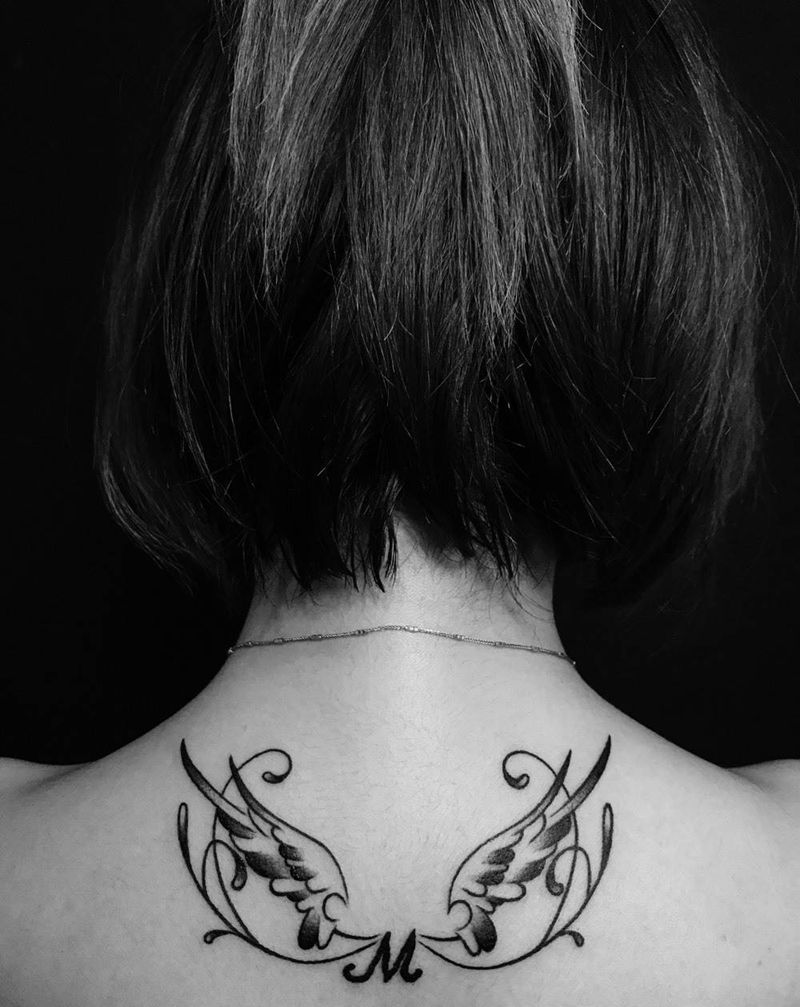 翅膀➕字母纹身图片_成品颈部背部纹身图案