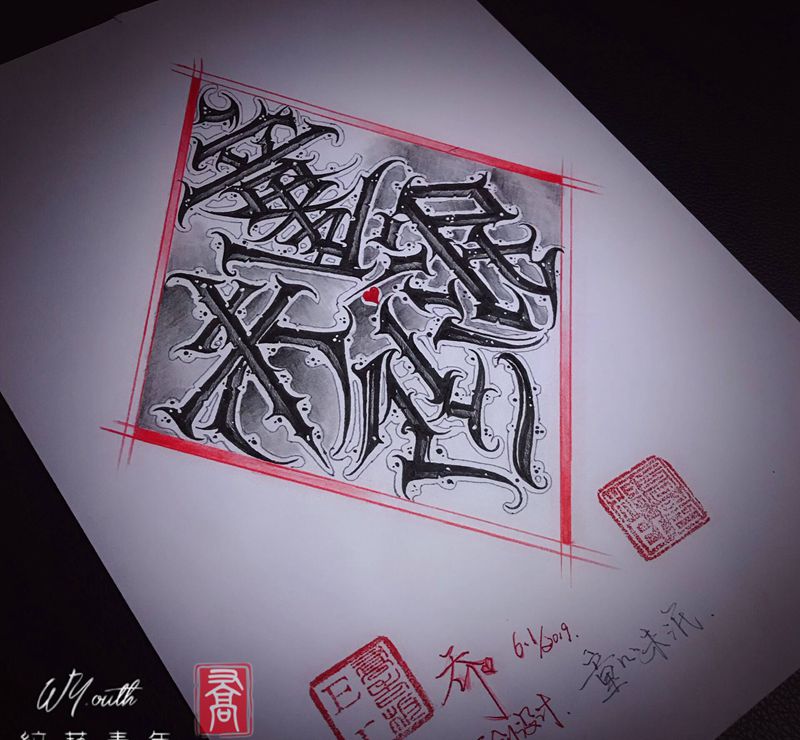 、汉字稿:童心未泯纹身图片_手臂花体字原创设计私人订制纹身图案