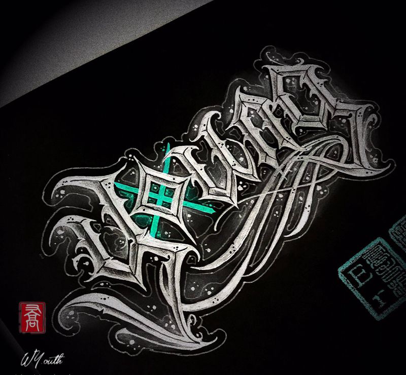 当前位置: 首页 >四川省成都市纹身店-纹艺青年刺青工作室纹身图案>、-原设预售稿young纹身图片_背部手臂花体字原创设计奇卡诺纹身图案