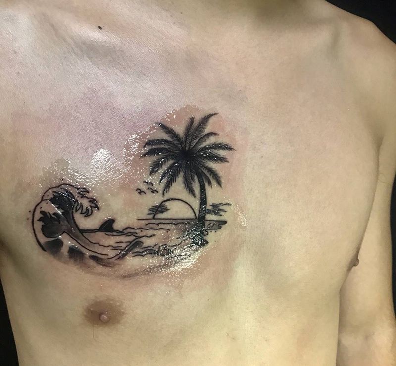 浪漫小海滩纹身图片_私人定制静物清新成品手稿胸部原创手稿纹身图案