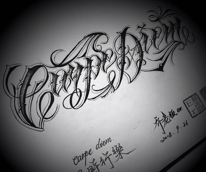 、-Carpe Diem纹身图片_手臂手部花体字原创一稿一次纹身图案