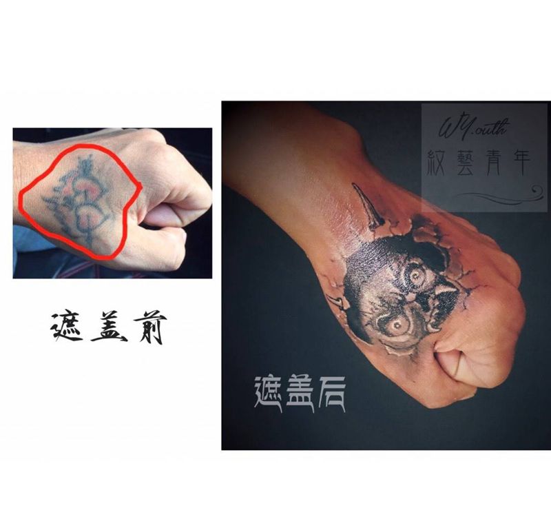 、虎口遮盖纹身图片_手部新传统遮盖原创纹身图案