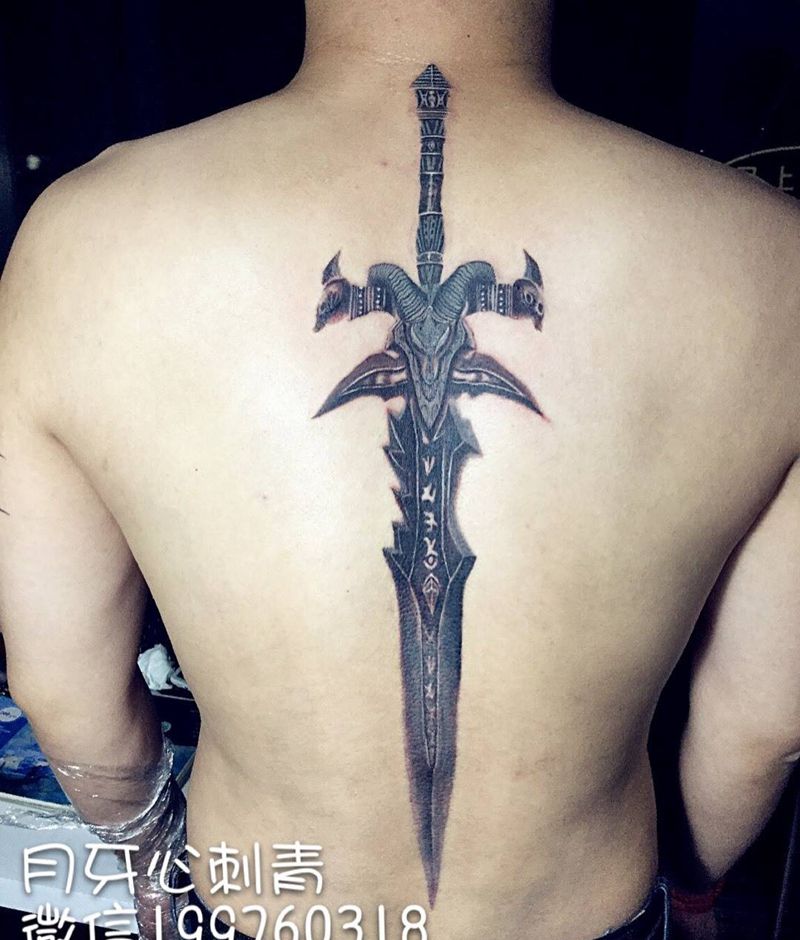 霜之哀伤纹身图片_原创背部成品写实剑游戏纹身图案