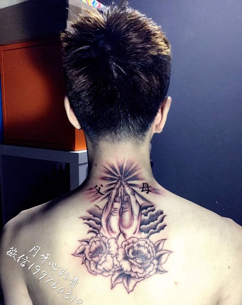 祈祷之手纹身图片_成品颈部背部欧美人物手祈祷祝福纹身图案