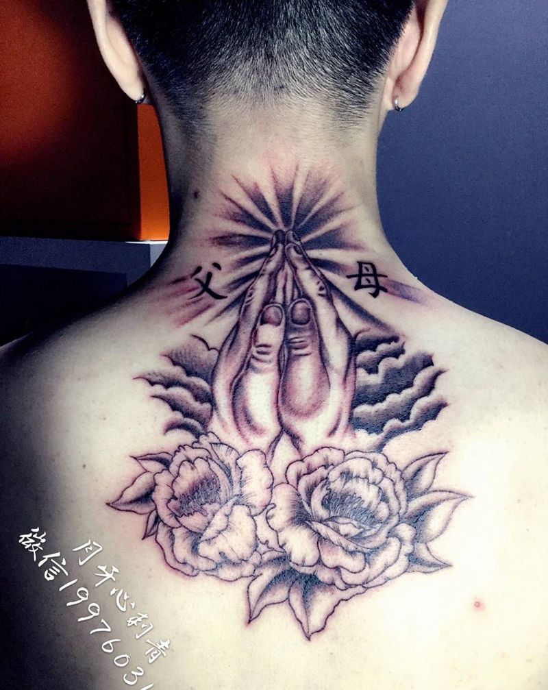 祈祷之手纹身图片_成品颈部背部欧美人物手祈祷祝福纹身图案
