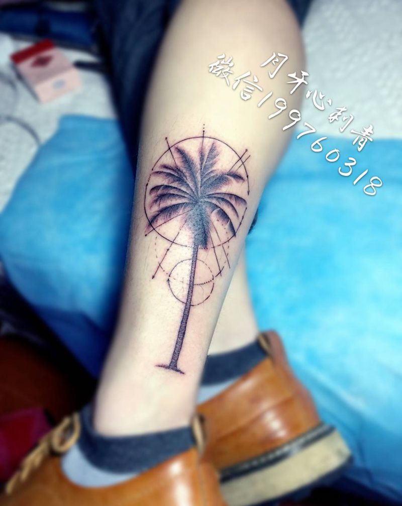 椰子树纹身图片_成品腿部脚踝清新植物椰子树纹身图案