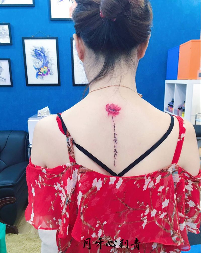 罂粟纹身图片_成品背部清新植物字符花英文纹身图案