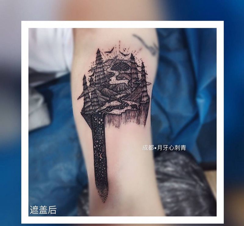 当前位置: 首页 >四川省成都市纹身店-月牙心刺青纹身图案>旧纹身遮盖纹身图片_手臂遮盖山水纹身图案