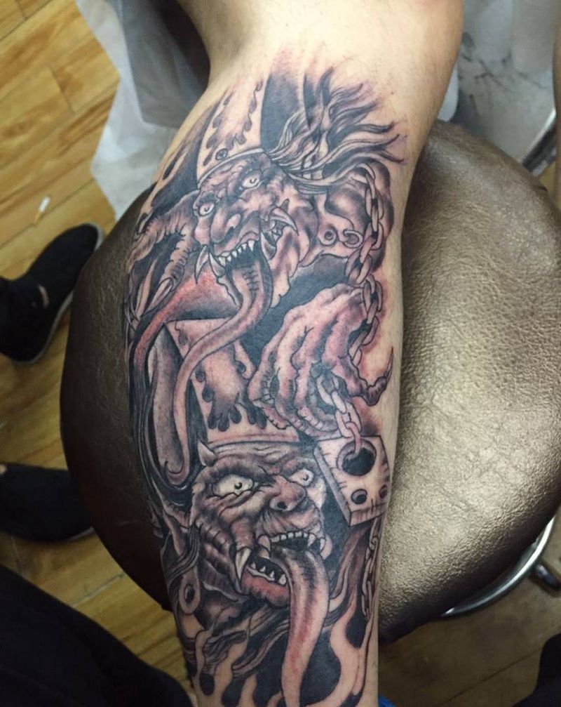 • T网红王老大花腿龙纹身图片_腿部新传统纹身图案