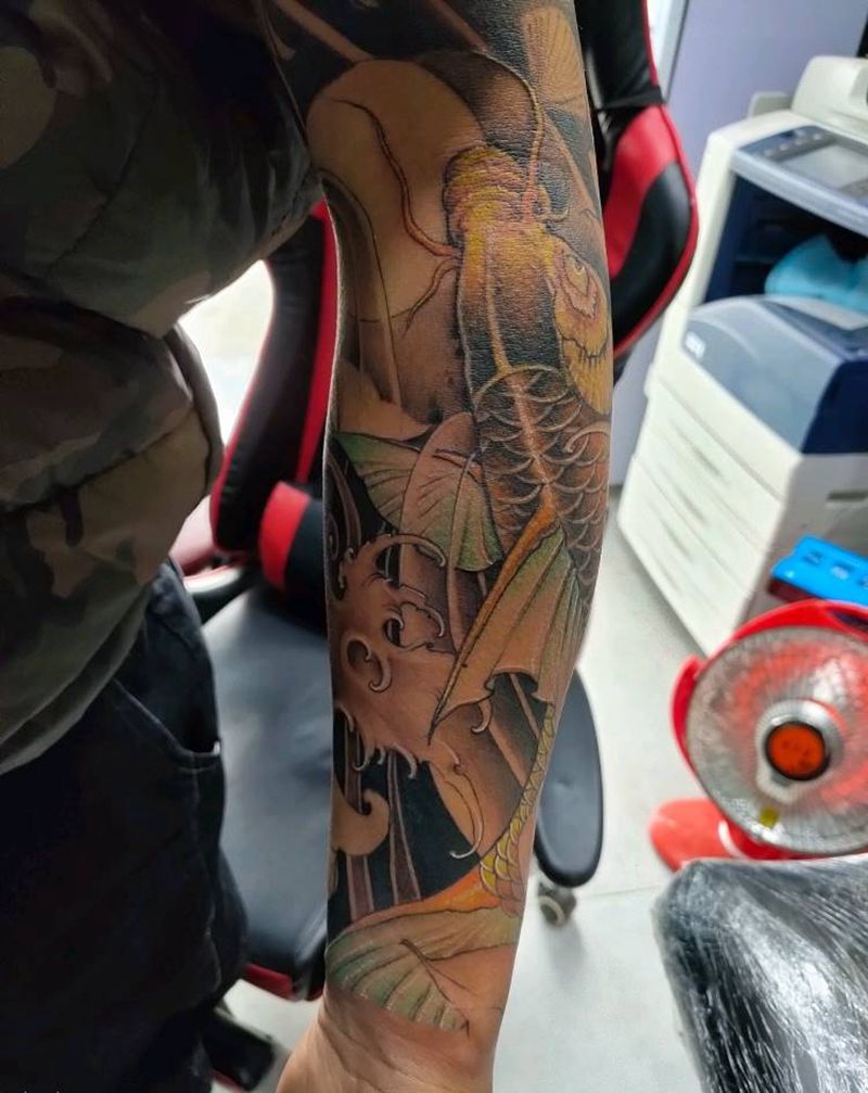 当前位置: 首页 >四川省成都市纹身店-成都臣象刺青纹身图案>锦鲤纹身图片_手臂新传统鱼,水浪纹身图案