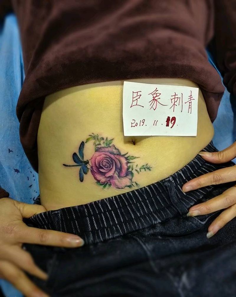 遮疤纹身图片_腹部水彩新传统蜻蜓玫瑰纹身图案