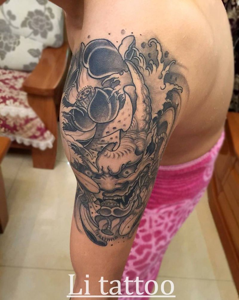 • T网红王老大花腿龙纹身图片_腿部新传统纹身图案