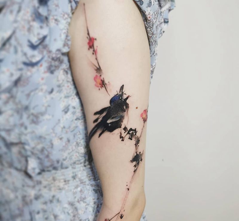 喜上梅梢纹身图片_手臂水墨纹身图案
