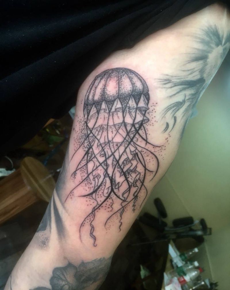 当前位置: 首页 >四川省成都市纹身店-蚂蚁刺青纹身图案>水母纹身图片_成品手稿肩部手臂欧美清新写实动物点刺水母纹身图案
