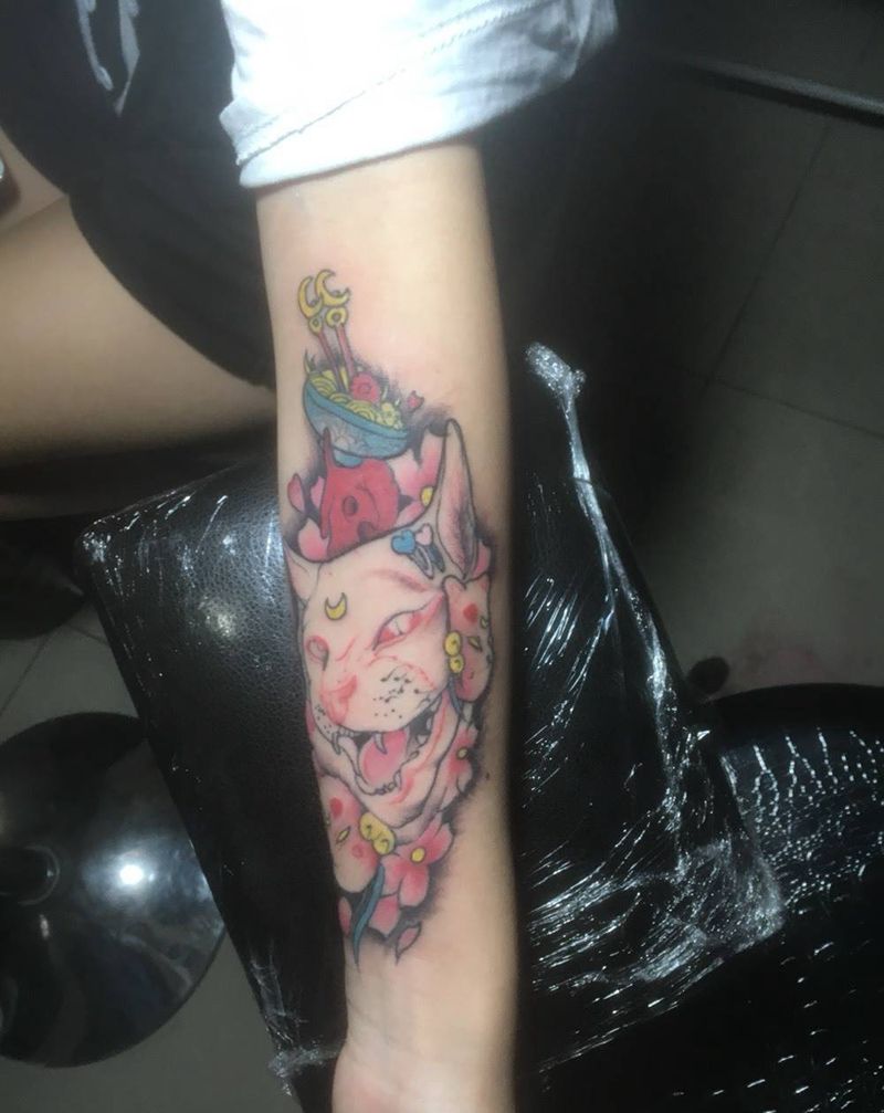 欧美面具猫纹身图片_成品手稿手臂欧美清新花臂樱花猫动物纹身图案